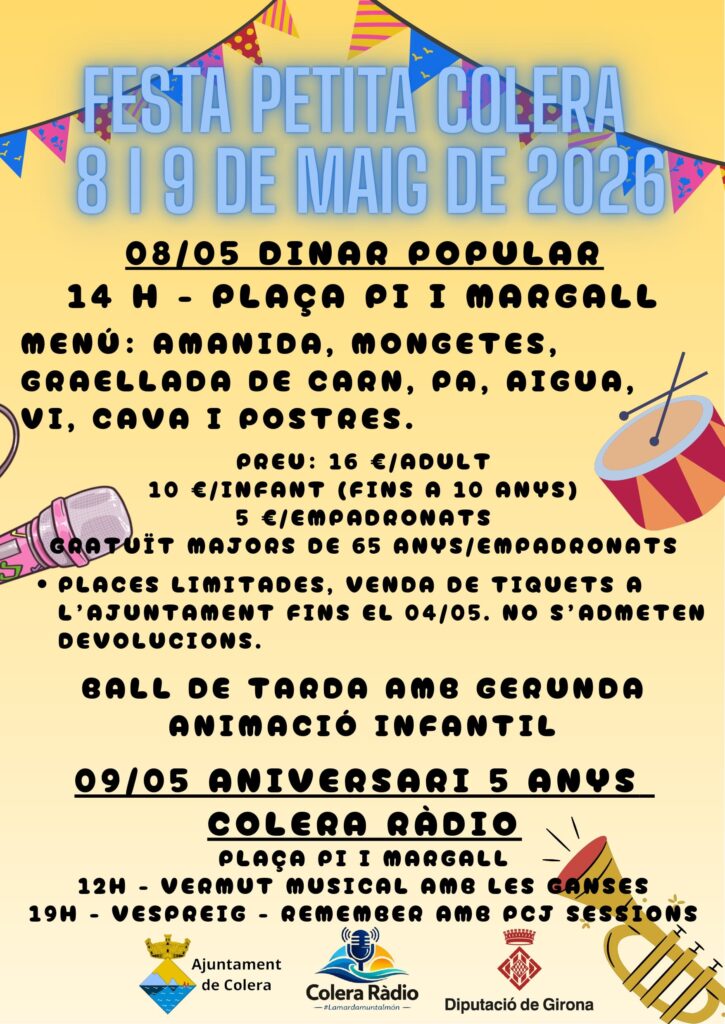 • 14 hores – Dinar popular (*Places limitades, venda de tiquets a l’Ajuntament fins el dia 4 de maig. No s’admeten devolucions)