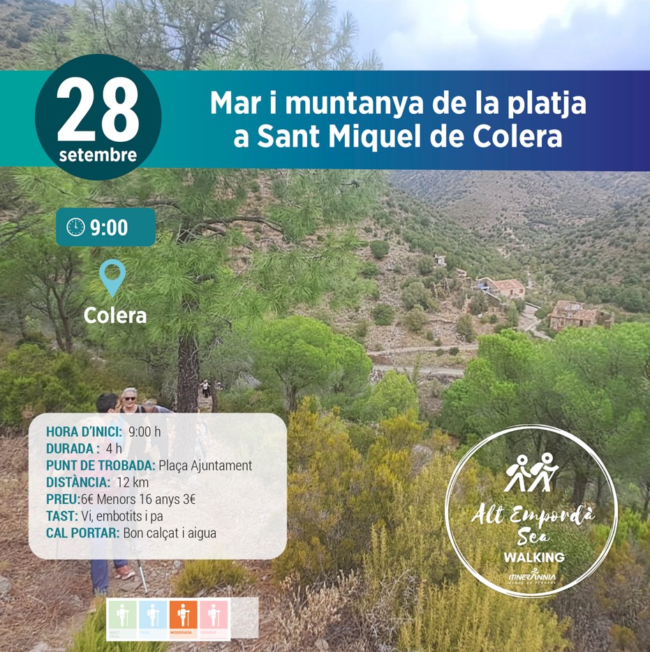 Agenda Mar i muntanya de la platja a Sant Miquel de Colera Diumenge 28 de setembre de 2025 | Plaça Ajuntament Hora inici: 09:00h Durada: 4h Punt de trobada: Plaça Ajuntament Distància: 12km Preu: 6€, menors de 16 anys 3€ Tast: Vi, embotits i pa Cal portar: Bon calçat i aigua < Entrada AnteriorEntrada Posterior >