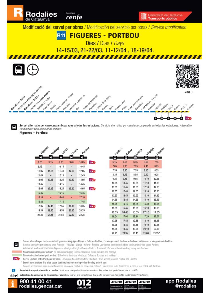 A aquesta notícia trobareu la informació relacionada amb la modificació del servei de trens per obres. Amb afectacions a la R11 Figueres – Portbou els dies 14, 15, 21, 22 de març i l’11, 12, 18 i 19 d’abril.