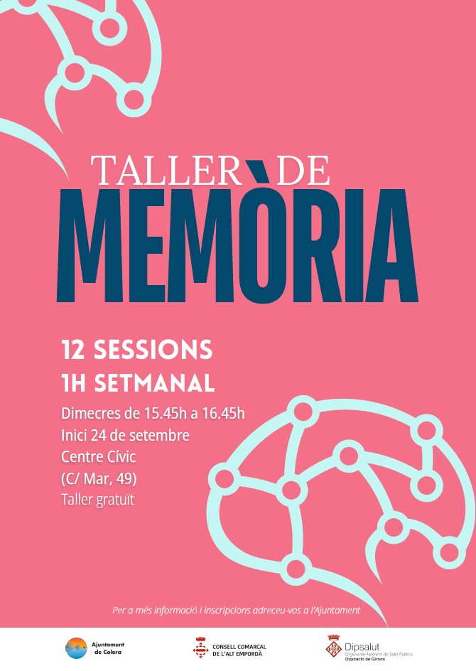 Agenda Taller de memòria Inici el 24 de setembre de 2025 | Centre Cívic 12 sessions, 1 hora setmanal Dimecres de 15.45h a 16.45h Taller gratuït < Entrada AnteriorEntrada Posterior >